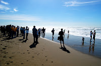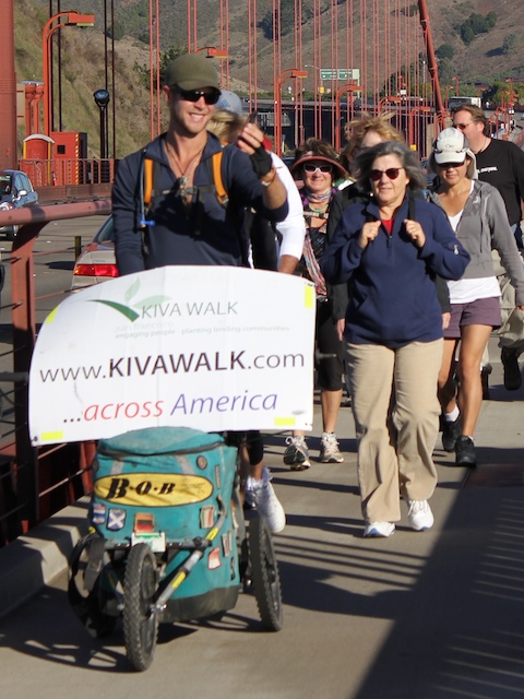 Saturday morning would mark the official end of Jonothan's KivaWalk. A group of nearly 40 supporters gathered at the Ferry Building to begin a full-day walk through and around beautiful San Francisco. The event would conclude at the Sports Basement in the Presidio, but not before a very important stop at the shoreline of the Pacific. With Jonathon and Kanoa leading the way, the group ran down to the waters edge to witness the end of an epic cross-country adventure. Jonathon eagerly jumped in the ocean, taking a brief moment to think about what he had accomplished: 3,030 miles on foot, from coast to coast, in support of Kiva. It was a wonderful moment to be shared. |