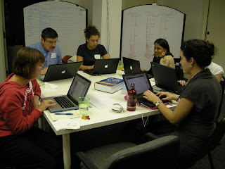 Volunteers working together at a December 2009 marathon to prepare for holiday traffic to Kiva.org (From left, Shelly Willard, Joe Castrovinci, Amy Schapiro, Lisa Shah, Catherine Coffman)